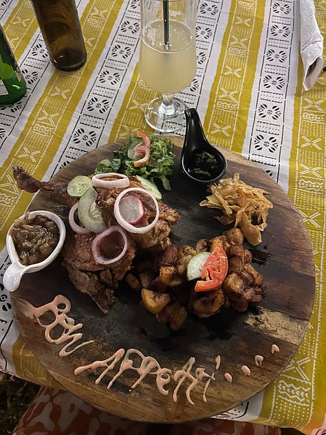 La session s’achève sur ces échanges. Nous retrouvons Monsieur Pascal, notre fidèle pilote, qui nous emmène déjeuner à La Savane. Au menu : igname pilé et poulet bicyclette.